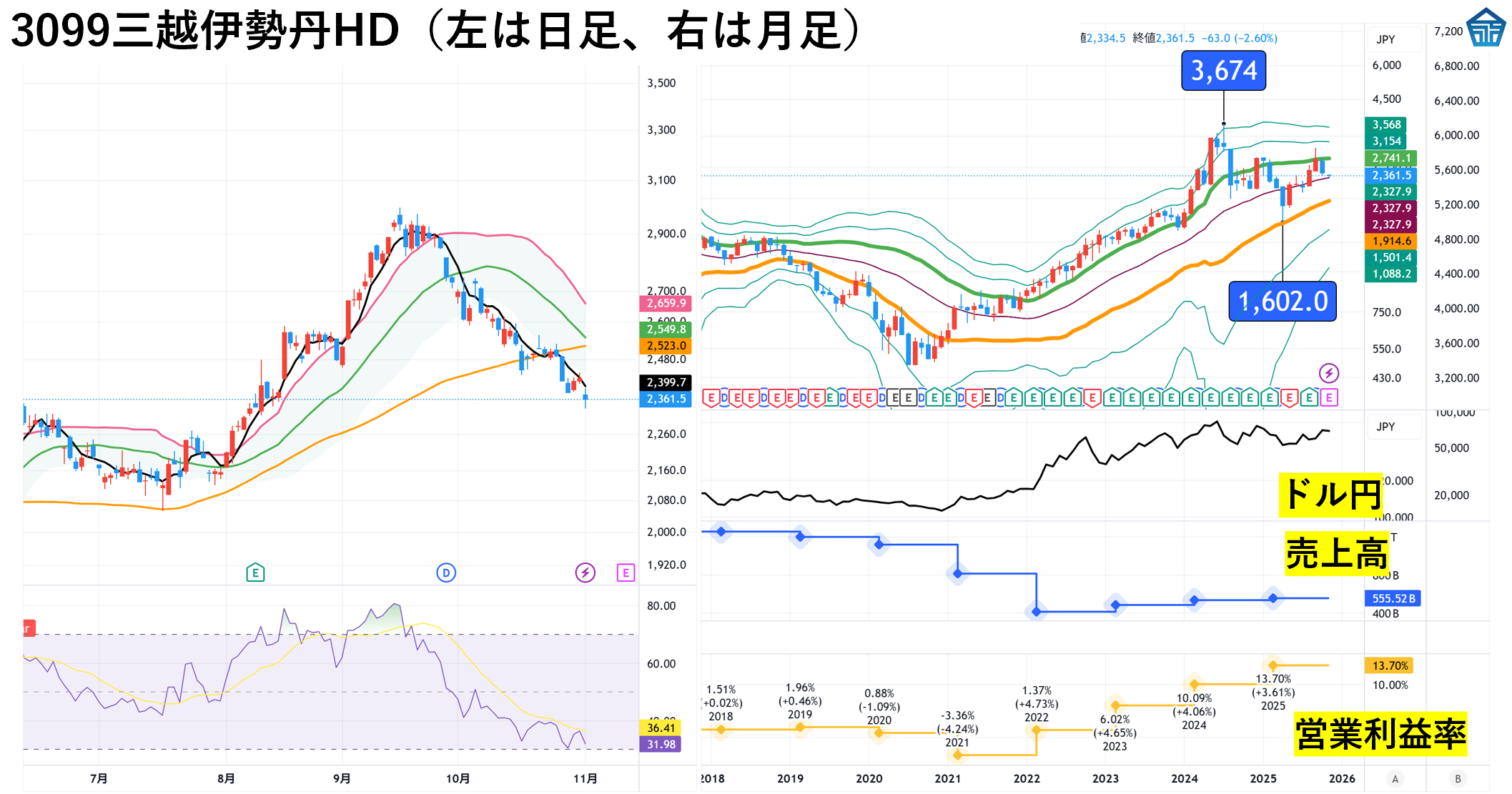 3099三越伊勢丹ホールディングスは2025年9月に高値をつけてから下落基調、8233高島屋は10月に高値をつけてから下落しております。