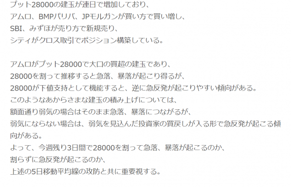 このように、株価が下落しても29000~29250に株価が戻りやすい需給状況となっておりましたが、